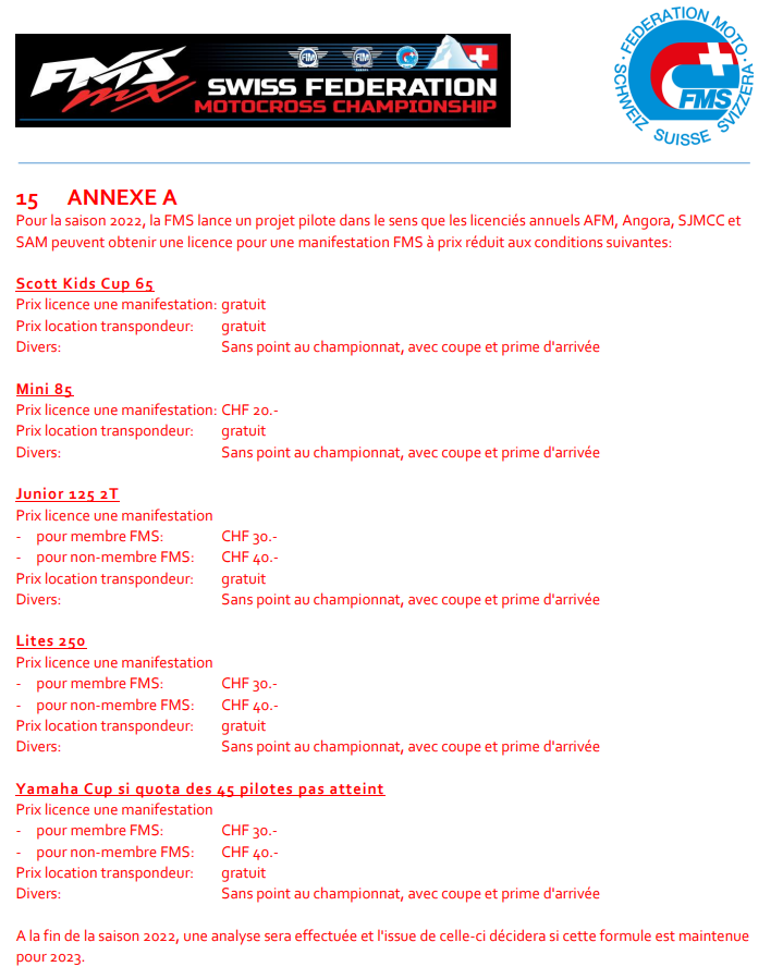 En effet, afin de pouvoir participer au championnat suisse FMS, les pilotes au bénéfice d'une licence annuelle des associations Angora, AFM, SAM ou SJMCC pourront obtenir une licence une manifestation à des conditions réduites pour certaines catégories.