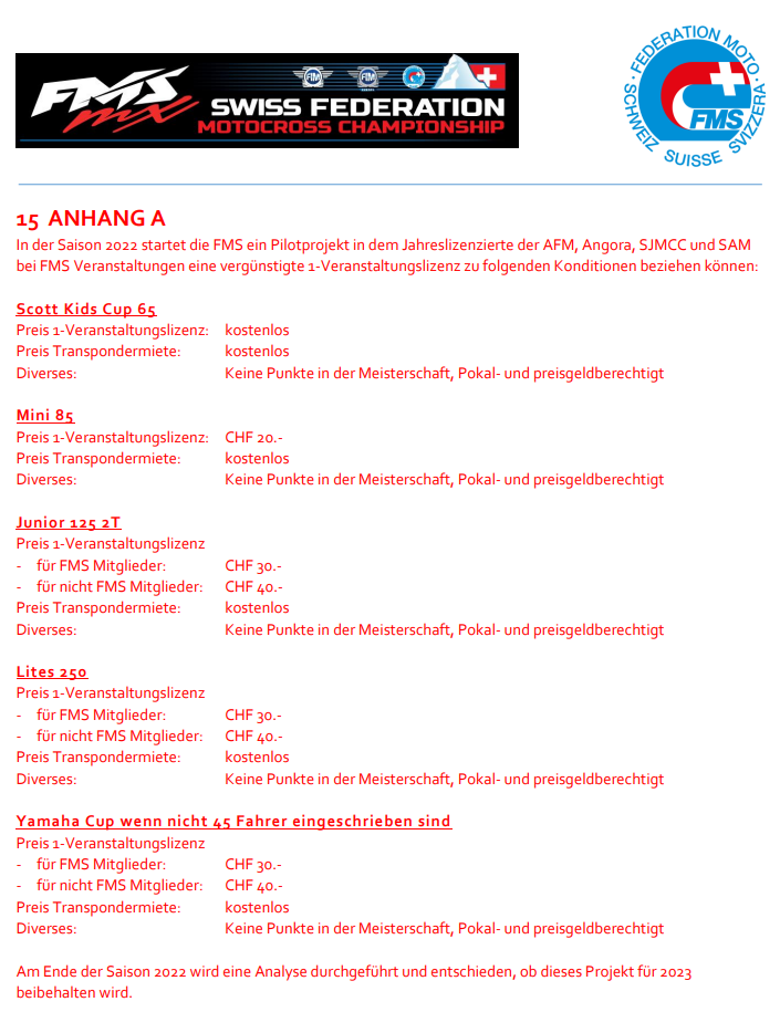 Dies betrifft folgende Kategorien: Mini 85, Junior 125 2T, Lites 250, Yamaha YZ Cup. Für die Kategorie Scott Kids Cup 65 ist die 1-Veranstaltungslizenz im Sinne der Nachwuchsförderung kostenlos.