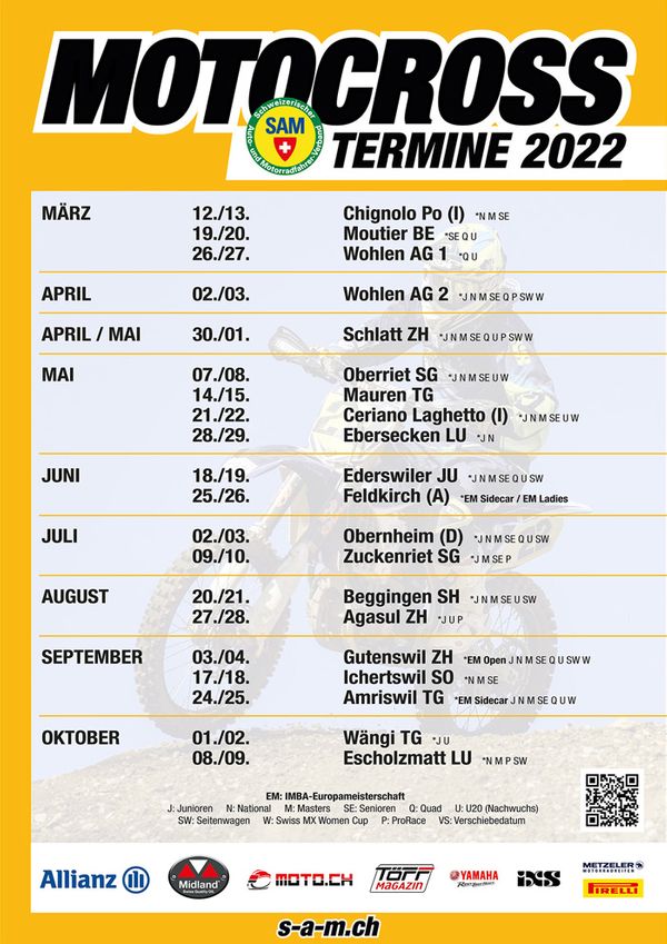 Der SAM Motocross Kalender wurde veröffentlicht und es stehen einige Rennen auf dem Plan für 2022. Der Startschuss ist bereits am 12. & 13. März in Chignolo Po Italien. Auch die Termine der Pro Race Serie stehen fest mit fünf Rennen in der Schweiz. Die Kalender der MXRS, Angora und der AFM Serie stehen bereits fest. Mann kann glaube ich sagen wenn uns der Virus kein Strich durch die Rechnung macht kann in der Schweiz von April bis Oktober jedes Wochenende ein Motocross Rennen fahren! Einzig der FMS Kalender ist nach ausstehend, dieser ist aber auch in den nächsten Tagen oder Wochen zu erwarten.