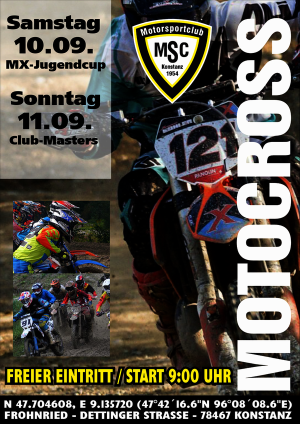 Le championnat des clubs et la coupe des jeunes MX auront lieu à Constance, juste à côté de la frontière. Il est encore possible de s'inscrire sur le site du MSC Konstanz.