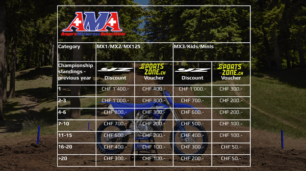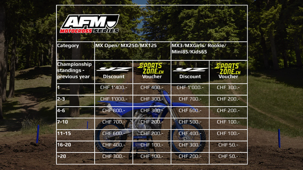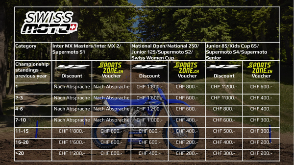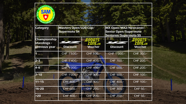 Profitiere jetzt von super Konditionen für die Saison 2025! Je nach Meisterschaft und Rang profitierst du von einem Rabatt bis zu CHF 1‘800.– für deine neue Yamaha YZ 2025 und einem Gutschein von sportszone im Wert von bis zu CHF 800.–. Unabhängig davon, ob du diesen Rang mit einer Yamaha oder einem anderen Bike eingefahren hast.